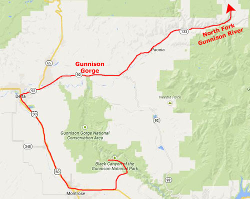 We would continue on east on Highway 92 until that highway began heading southeast (to rejoin US Highway 50 a good ways east of the National Park. At that point we headed northeast on Colorado Highway 133. This road would take us further north and east very near the northern boundary of the Gunnison National Forest and, for a stretch, alongside the North Fork of the Gunnison River.