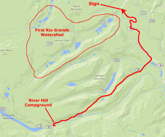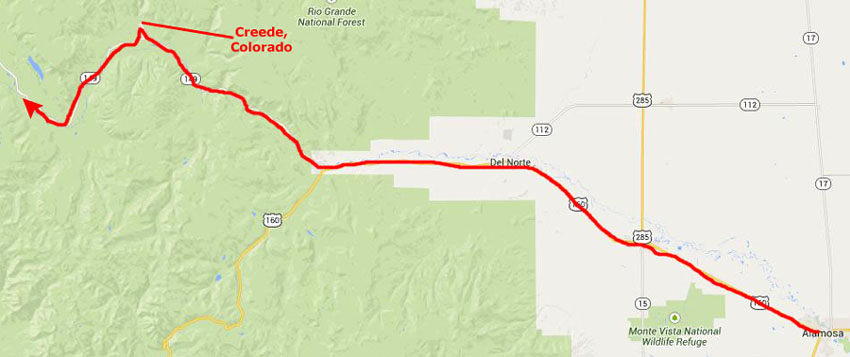 After about 45 miles of scenic mountain driving, we are about ten miles past Creede, where we begin to look for the National Forest signs that will indicate the turnoff to the campground for tonight. This turnoff actually came at the point where the river continues west but the highway heads north.