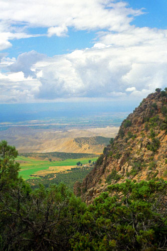 Since leaving the National Park, we had been driving through relatively level farmland, although this farmland is well over a mile high. As we came around the top of Gunnison Gorge, the road ascended for a time so that as we drove, we had views out to the left looking down at the verdant farmland and views out the right at Gunnison Gorge.