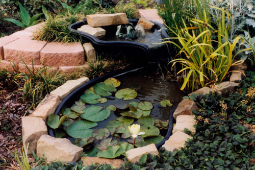 Just below Fred's back porch he has had, for a long time, a copse of native plants and two small trees; the copse is generally ovoid in shape, covering an area of about six by ten feet. Recently, he has installed a lily pond that is visible from the porch. It was constructed of two plastic forms- an upper and a lower- with the upper form having a spout that allows water to fall into the lower pool. He has a submerged pump, of course, that returns water to the upper pool.