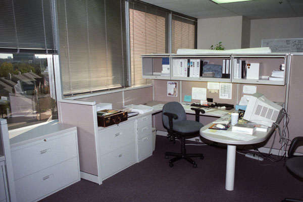 We also have a lot more space here than downtown; office space is a lot cheaper up here. So I now have my own cubicle with lots of light and a nice view. That's it in the picture at right.