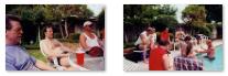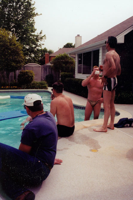 Usually, I know just a few of the people there, since Brad's social circle doesn't overlap with mine all that much. Our friend Lou (the person at left in the picture at left) was there, as was my first doctor in Dallas- Rich Olsen. He is standing at right in the picture shown here. Brad himself was so busy getting food ready or greeting new arrivals or talking with friends that I had an impossible time getting a good picture of him. The best I did was this picture of him standing by the pool.