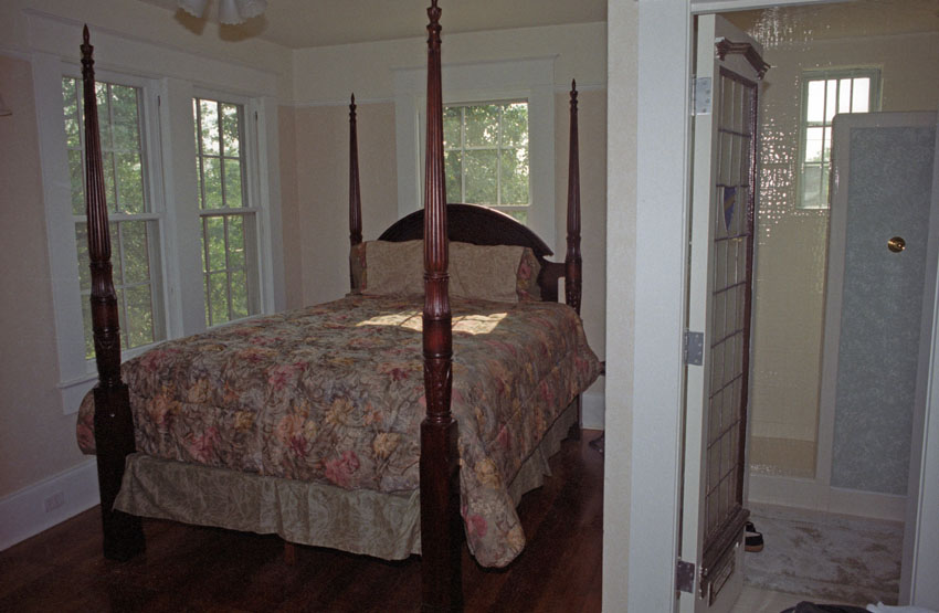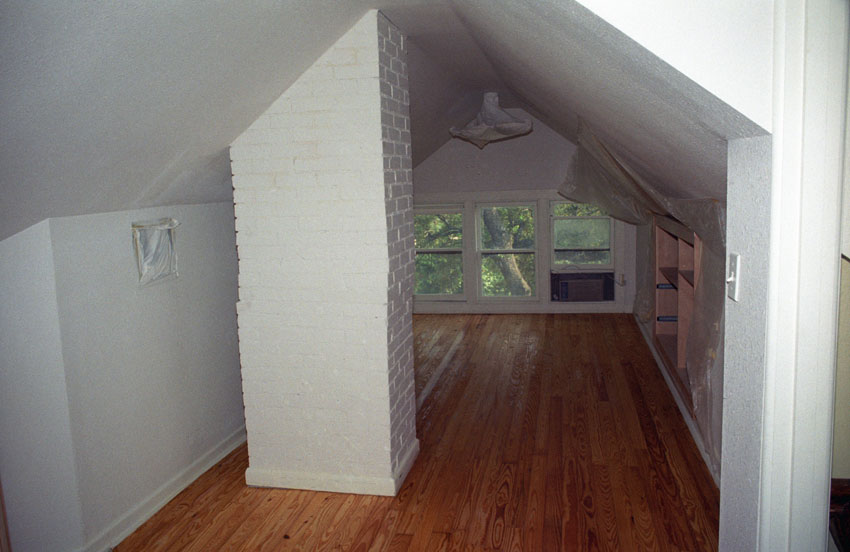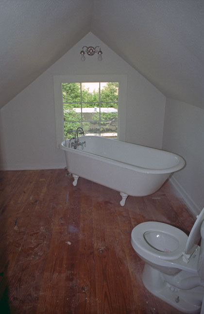 At the top of the second flight of stairs is the former attic of the house, and it has been transformed into a suite. There had to be modifications to the roof line to raise it in one spot, and the construction people had to work around some load-bearing columns and the chimney. The suite will be L-shaped with the sides running north-south and east-west. In the corner of the "L" is the new bathroom; on one side there is the dressing area and main bedroom area and on the other is an area that will have a daybed and sitting/reading area. Click on the links below for views of these areas in progress: