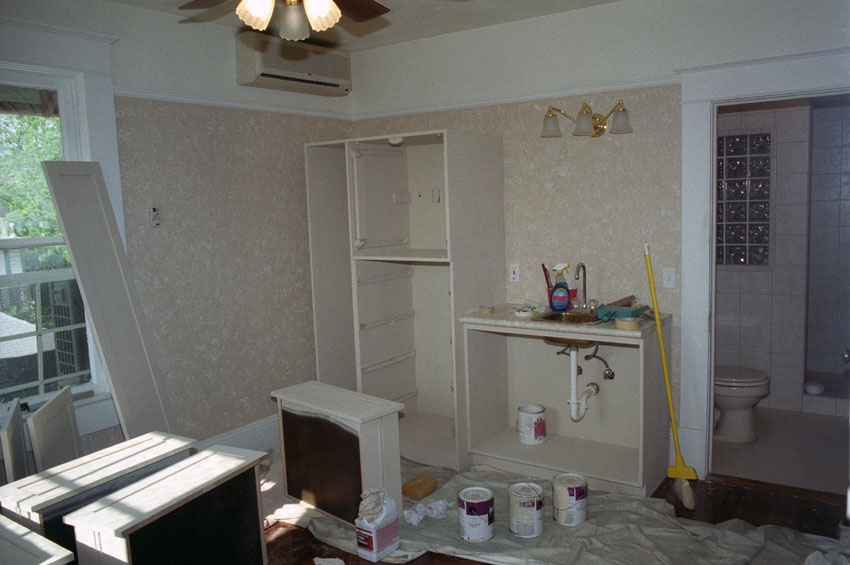 The renovation of the Luxembourg Room, which will be the smallest of the rooms, is also well underway. The framing for the cabinetry has been put in, and the tilework in the bathroom is completed. This room has windows that look north. You can see this work in progress here.