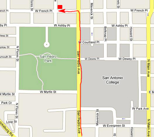 Finally, you just take San Pedro Avenue by San Pedro Park on your left, and, one block past the park, you turn left onto French Place. Prudence and Ron have bought the house at the end of the first block on your right.
