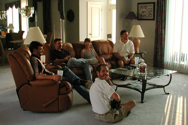 The picture at left, taken by Fred in their living room, doesn't show everybody, but it does show (from left) Ron M., Brad, Lynne, Lou and, seated on the floor, myself.