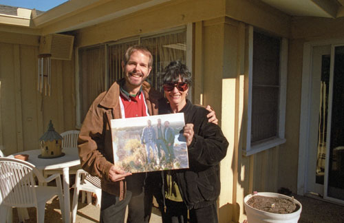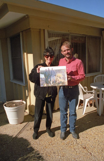 One day in December, we drove out to Mrs. Racke's house in Irving to give her one of these canvas transfers. In the photo at left, Fred and Mrs. Racke are holding the picture.