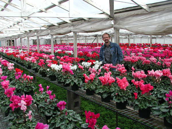 One of the pictures Fred gave me shows him in one of the greenhouses at Crumps Garden up in McKinney. He is standing in the midst of one of their crops of cyclamen.