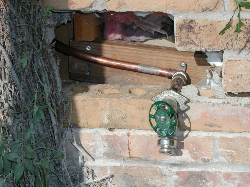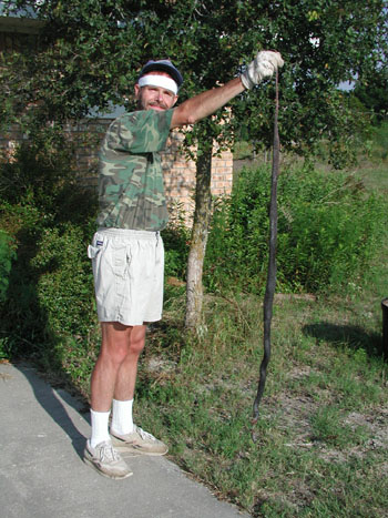 at the front of his house. When he started working on it, we had to go and turn the water off at the meter, which is out by the front gate, and he asked me to go do that. When I pulled the cover up, I got quite a surprise- a large black snake had taken up residence down in the meter well. I called Fred over and we woke it up with a garden hoe and then dispatched it with the same hoe. (We would usually have just goosed it away, since it wasn't poisonous, but then it would just have returned to its cool spot, and encouraging a snake to nest there wouldn't be the best idea in the world.)