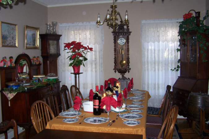 My usual tradition is to cook a Christmas ham on Christmas Day, and have as many people over as possible. This tradition was developed early and used often, but the reason has more to do with the dearth of invitations to Christmas dinners elsewhere. There aren't (and never have been) many friends of mine who cook, and, even when someone does, their situation isn't often such that they can also issue invitations. So it was actually a welcome change from tradition that Fred and I had received an invitation weeks ago from Tom Harris and John Evans to come to their house on Christmas Eve for dinner.