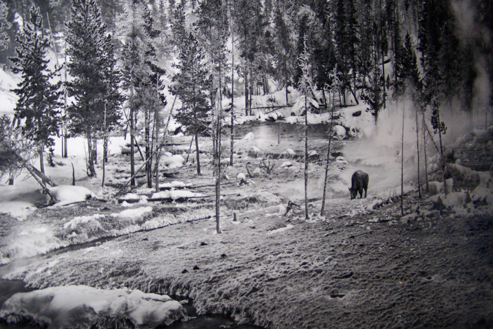 Here are two photos of Fred with his new artwork. The first is a close-up of the artwork. It is actually, if you can believe it, a photograph, taken with such high-quality digital precision that it can be blown up to almost 3 feet by 2 feet and still retain absolute clarity. It is, of course, a buffalo in a forested winter scene. And here is another view of the the artwork and its proud owner.