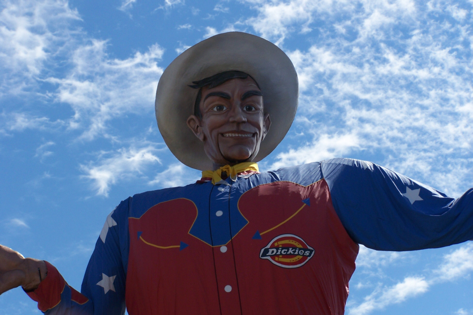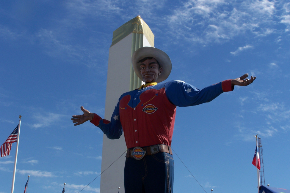 The line at the corny dog stand was pretty long, but the guys seemed to think it would be worth the wait. For myself, I stopped at a different stand for some curly fries and a drink. These particular food stands were at the crossroads of the Fair, the spot where the symbol of the Texas State Fair, "Big Tex" is located. Big Tex has been around for as long as I've been in Dallas, and was probably in place a lot longer than that. Although in this day and age, were he to be reconstructed, he would probably be animatronic- that is, he would move in various ways. But he's not that up-to-date; all he can do is talk via pre-recorded tapes. He welcomes fairgoers, gives outgeneral information- that sort of thing. He is tall, however, and he towers over the midway.