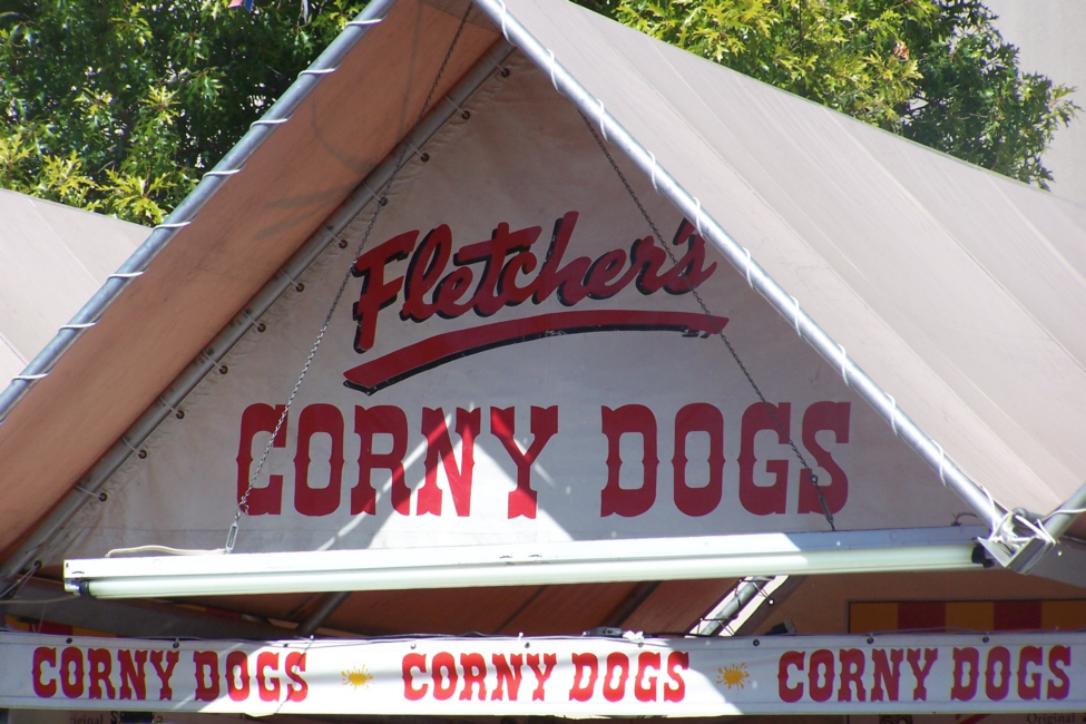 Lunch was on everyone's mind when we arrived and nothing, it seemed would satisfy except Fletcher's original corny dogs. There are lots of corny dog stands at the Fair; the idea isn't patented so lots of people make them. But Greg and Tim would accept no substitutes, so we headed over to the Midway area so they could visit the Fletcher's corny dog stand.
