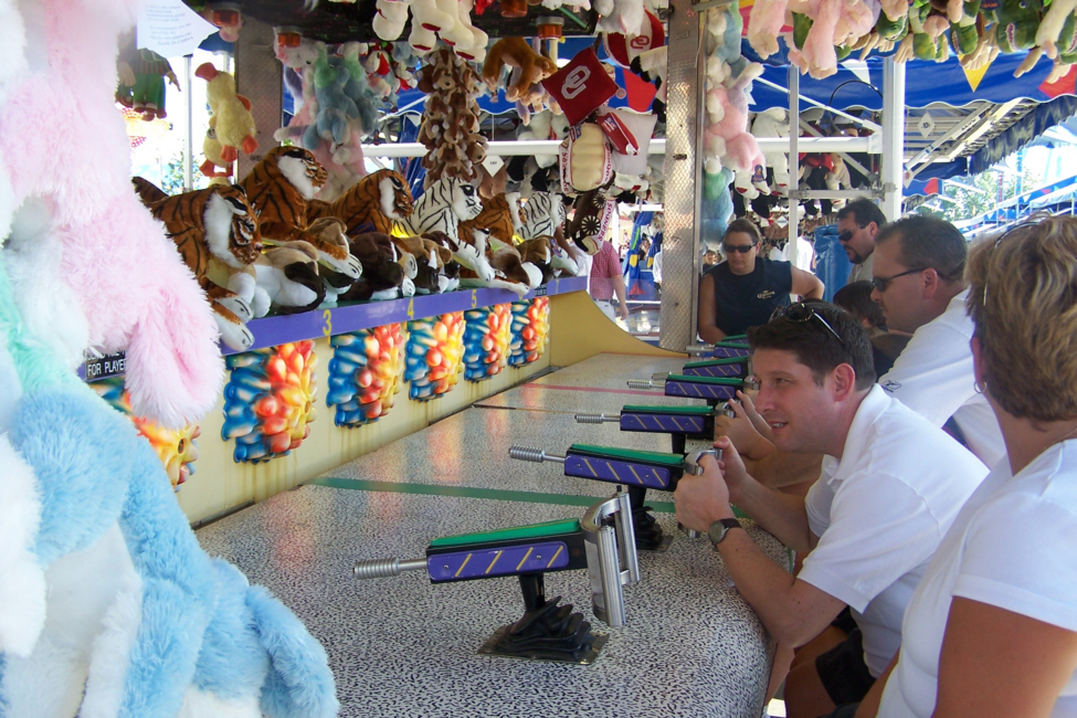 No fair or carnival would be complete, of course, without a Midway- the name given to that area of the fair where one can find the "games of chance," which in truth are just a little less than random. In recent years, local authorities have taken steps to ensure that the most egregious scams (e.g., trying to knock over bottles that are wired together or weighted) have been eliminated, but most of the games are still quite a bit more difficult than they look. We didn't play many, although Tim tried his luck at one of the shooting games.