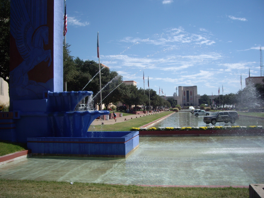 We met over at Tim's house, and the four of us headed off for the Fair about noontime. Tim had already picked up some discount tickets at Albertson's, so we all paid him and drove over to Fair Park. Fair Park is quite near downtown and is the location of the Cotton Bowl:
