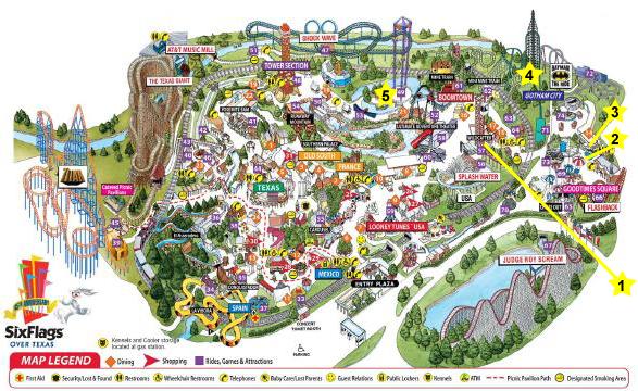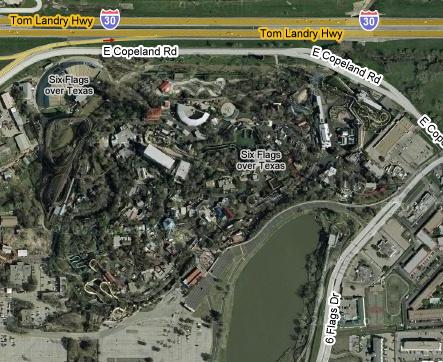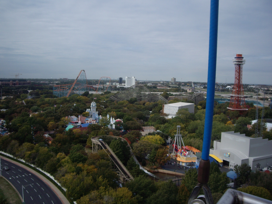 The next ride was the parachute ride- The Texas Chute Out (#2). This is a fairly tame ride, as you are raised up into the air and then float to earth on a controlled parachute. I did the ride once, then went again so I could take this picture of Six Flags Over Texas.
