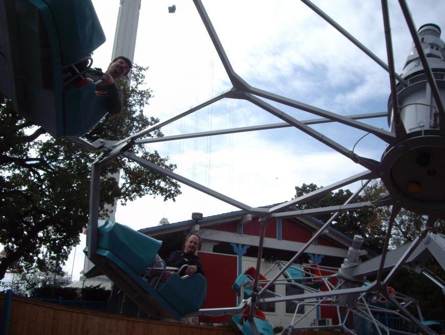 While we were in Good Times Square (#3 on the map), Ron and Fred took a ride on "Crazy Legs," one of those tilt-a-whirl rides but up in the air. I tried to catch a picture of the two of them as they zoomed past, but they were almost out of the picture when the shutter snapped. See if you can locate them in the picture here.