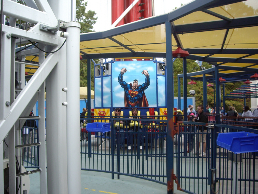 Our next stop was "Superman- The Ride." (#5 on the map) Rather than describe the ride, which was made rather more interesting for me due to the fact that I was already a bit queasy from "Batman- The Ride," comic book superhero characters not, apparently, being my best overall choices for amusement park rides, I will just show you. First, here is a picture of Ron and Jay waiting for Superman. I realize that the static picture doesn't explain the ride very well, so why don't you watch the movie I made of it using the right-hand player below: