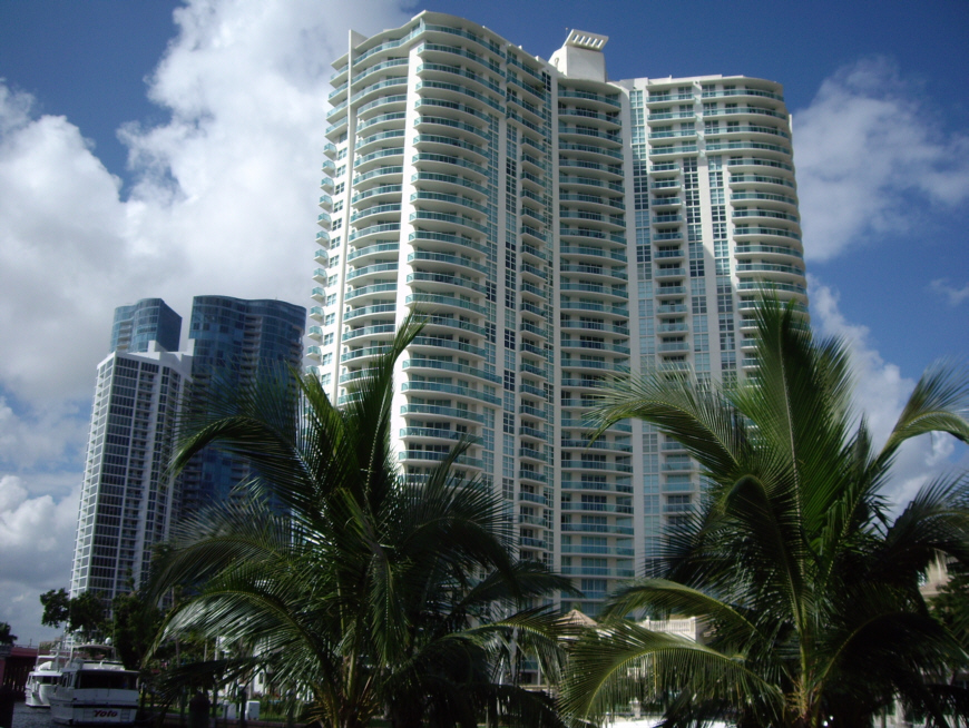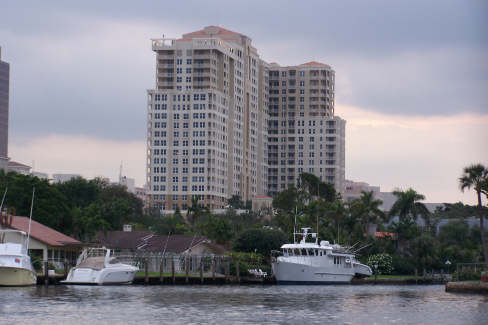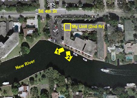 Fred took this picture from the dock looking west up the New River towards the southern edge of downtown. The yellow arrow #1 shows the direction in which the picture was taken. Downtown Fort Lauderdale, at least the commercial part of it, is bounded on the south by the New River, and only some government buildings are south of the river. Looking in the same direction, this closeup shows one of the newest condominiums downtown, this one being just across the 3rd Avenue Bridge from downtown, and just a block west of Federal Highway- the road that goes through the McKinney Tunnel under the New River about three blocks west of my condo.