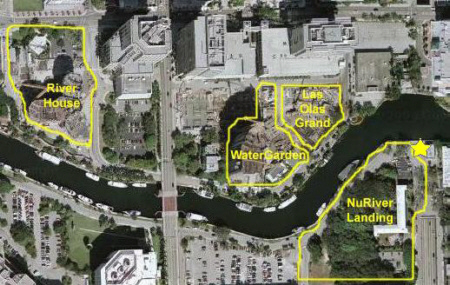 Fort Lauderdale has changed a very great deal in the last two years. The aerial view shown above was taken about that long ago; only the River House is actually rising above ground level. In our bike ride, we stopped almost exactly where the yellow star is, and the picture at left was taken looking almost due west- directly upriver. I have outlined on the aerial view where the new buildings have risen, and you can see the massive, mid-rise NuRiver Landing at the left, the WaterGarden in the center and the Las Olas Grand rising at the right. River House, which is actually slightly taller than either the Grand or WaterGarden is hidden by both those buildings.