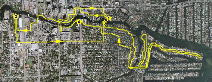 The weather was a bit overcast through Tuesday, but on Wednesday, things cleared out and the weather turned absolutely beautiful. I thought it might be a good idea to bicycle through some areas of Fort Lauderdale that Fred had not seen before (even though they are only a stone's throw away)- right across the New River. And we decided at the same time to work in a stop at Shirttail Charlie's for lunch. Below, I've marked up an aerial view of the area we covered so you can get an idea of where we went.