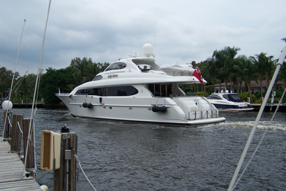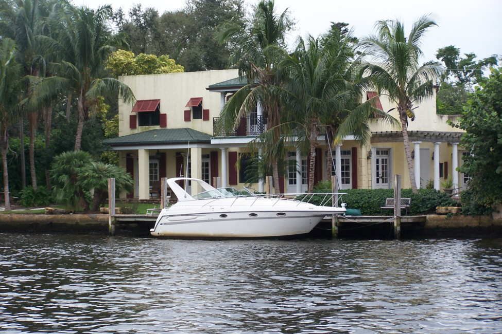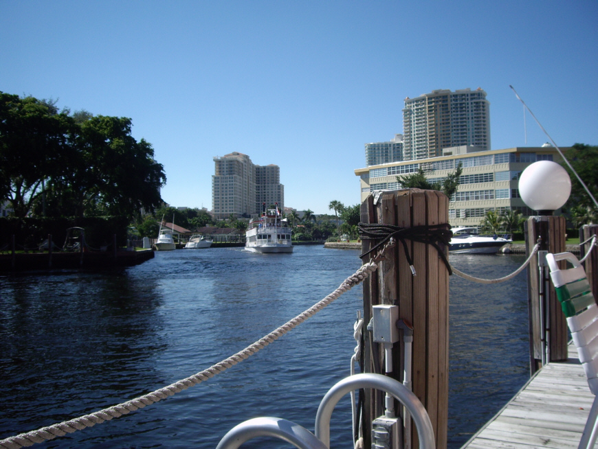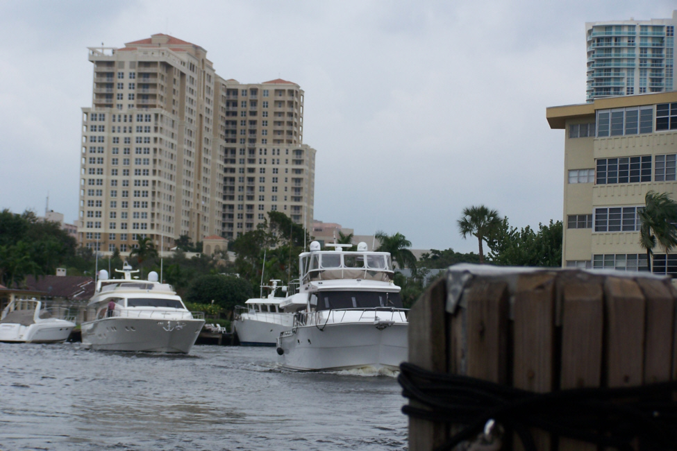The land that fronts on the New River is extremely desirable, and so it is very, very expensive. An average lot here can easily run in the high six figures or even over a million towards the end of the finger where more water surrounds you. Since the land is so expensive, wealthy folks don't skimp on the houses they situate on that land, and all the houses on the New River are quite large and mostly new. There was a lot of construction going on; just about every third or fourth house was being newly built or extensively remodeled. On the south side of the finger, the houses were only slightly smaller. All in all, the residences were typical of the nicest parts of Fort Lauderdale. We are both continually impressed by how much money there must be represented here- most of it tied up in houses and boats.
