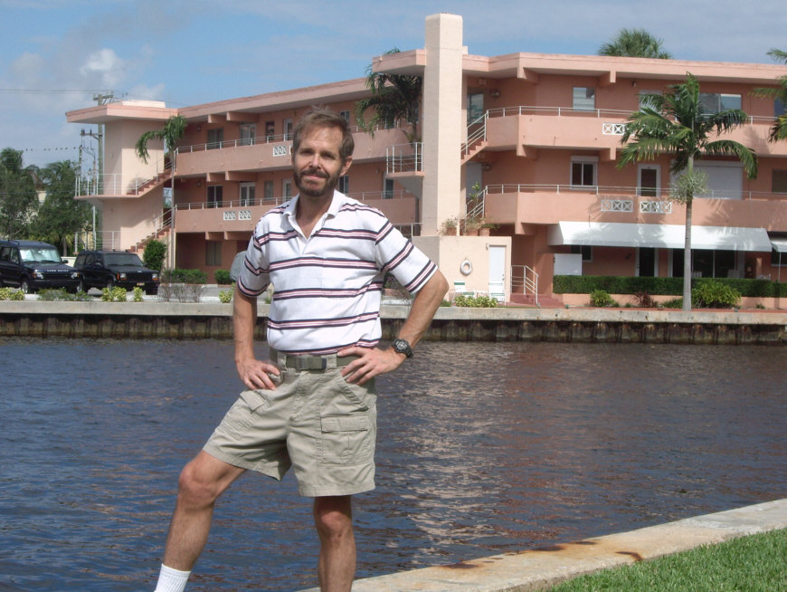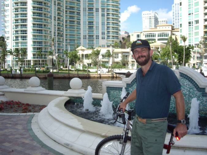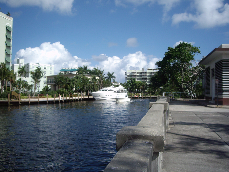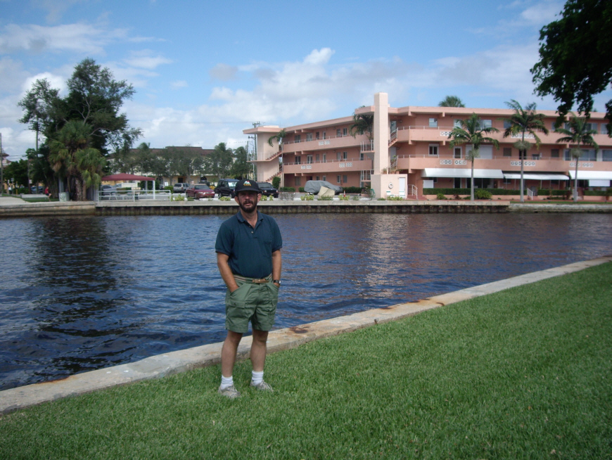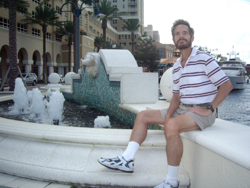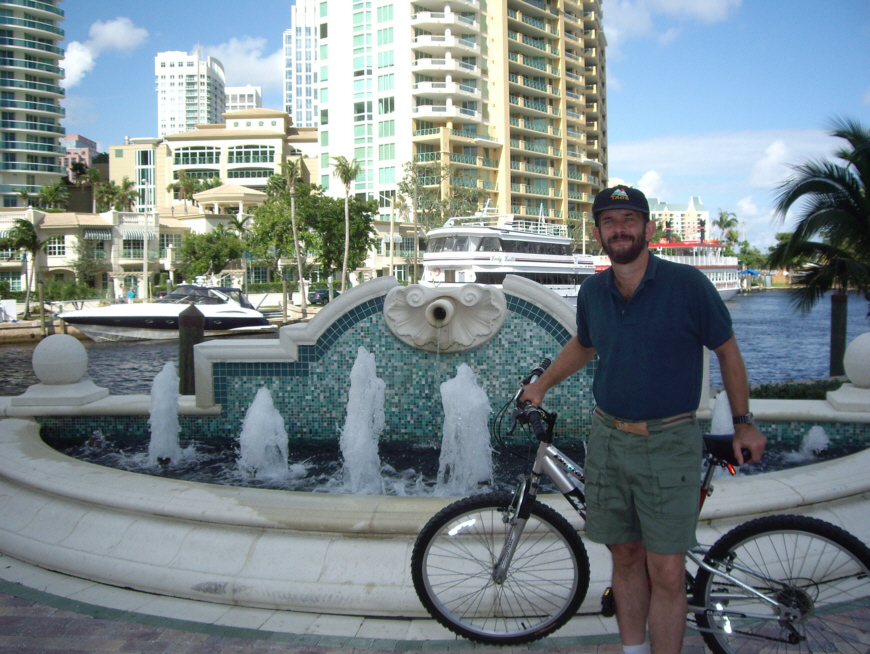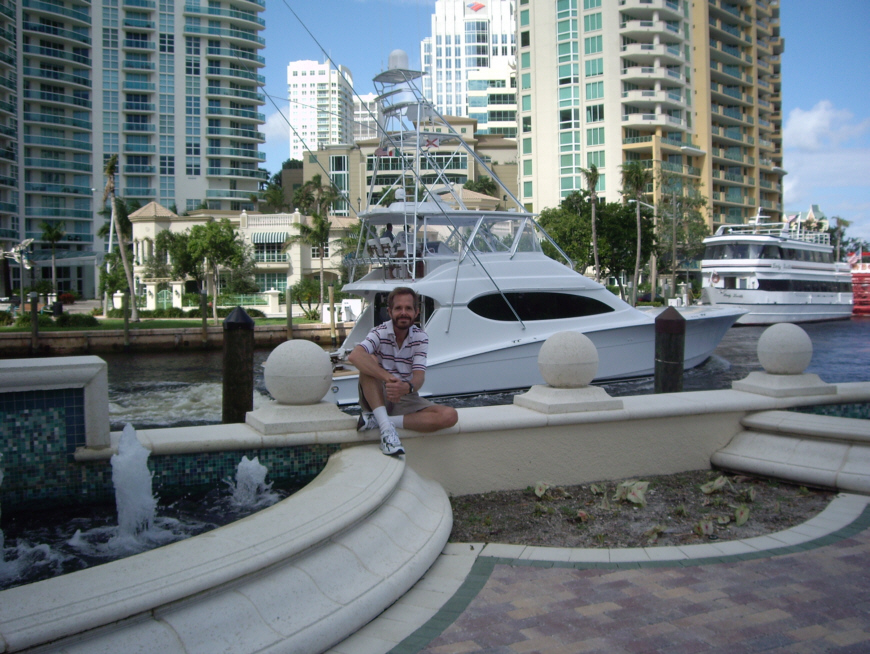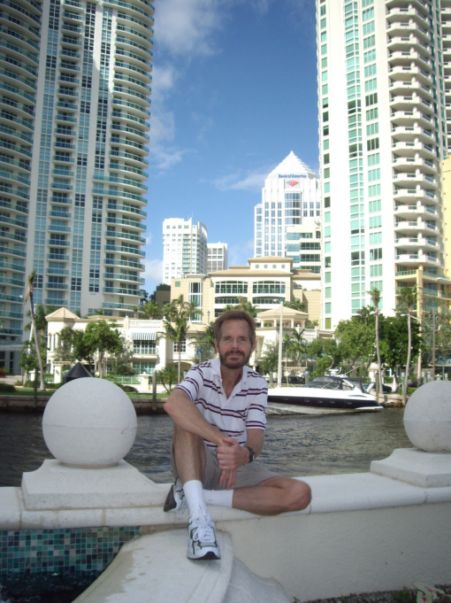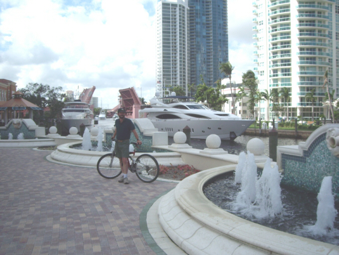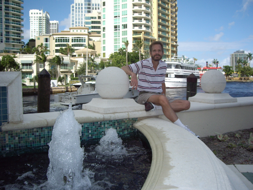 For some additional pictures, here's one of me with downtown Fort Lauderdale in the background. I'm sitting on the river wall and one of the dinner cruise boats is docked on the other side of the river behind me. That's the WaterGarden (left) and the Las Olas Grand (right) on the other side of the river. And here's an even better view of me with a downtown backdrop. This picture shows more detail of the NuRiver Landing fountains. And, finally, here is a shot, looking upriver, of me at NuRiver Landing.