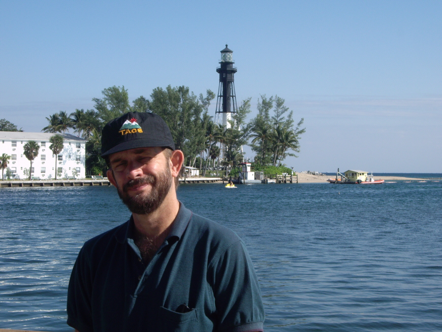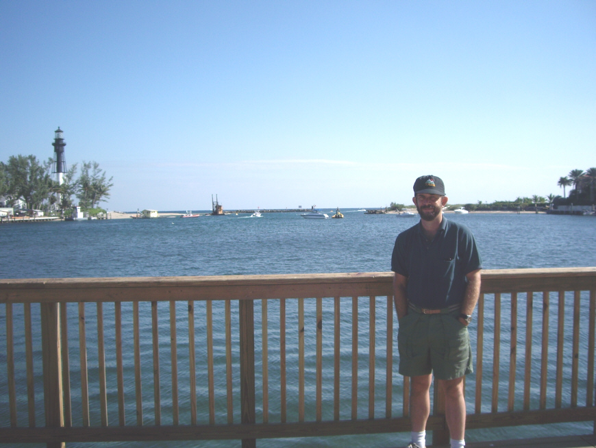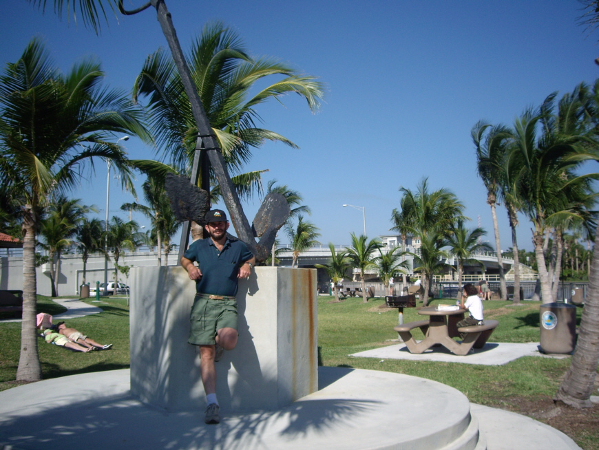 We took a few pictures here. The first one looks out to the ocean and is of Fred and the Hillsboro Lighthouse. The next one shows Fred and Hillsboro Inlet Park. There is a sailor's memorial here, and that's what Fred is leaning against. The Hillsboro Inlet Bridge is in the background, and this picture gives you a good idea of what the park looks like.