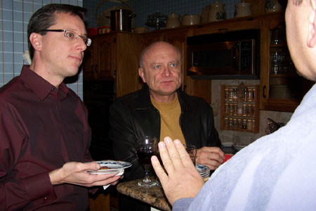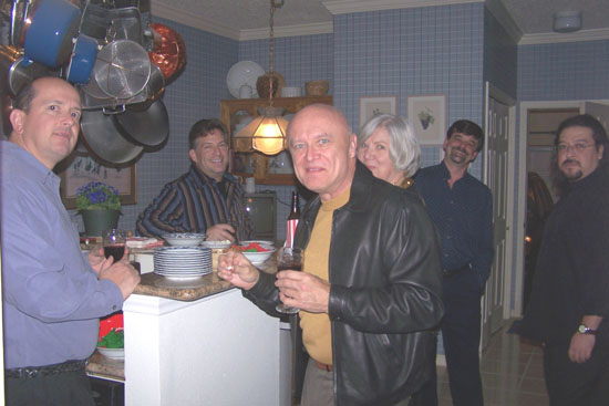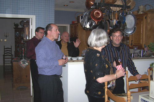 First, Fred took a number of candid shots of Tim Brown (tall with glasses), Rich (solid-color blue shirt), Greg (dark yellow turtleneck), Barbara (sophisticated gray-haired lady) and Lou (vertical-striped shirt) drinking and chatting in the kitchen. You can see these pictures both above, left, and below.