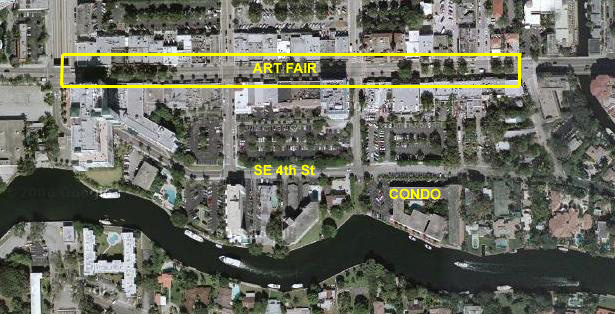 The Art Fair is held along Las Olas Boulevard from the Cheesecake Factory on the west (right over the Kinney Tunnel) to the intersection of SE 4th St and Las Olas on the East (if it went any further, we wouldn't be able to get in or out of our neighborhood). All the cross streets are blocked off, and the vendors' stalls are set up in two rows, back to back, on top of the median down the middle of Las Olas. The Fair is always absolutely full, and sometimes there is a bit of overflow into the side streets. The Fair is always fun to attend- and easy, too, since it is only a block from the condo.