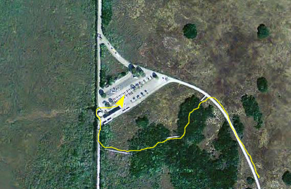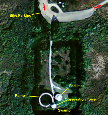 As you can see from these two pictures and the aerial view, there is a circular building built on piers just about twenty feet above the swampy area below. It is in this building that there are some facilities (the only ones on the 15-mile route) and some exhibits.