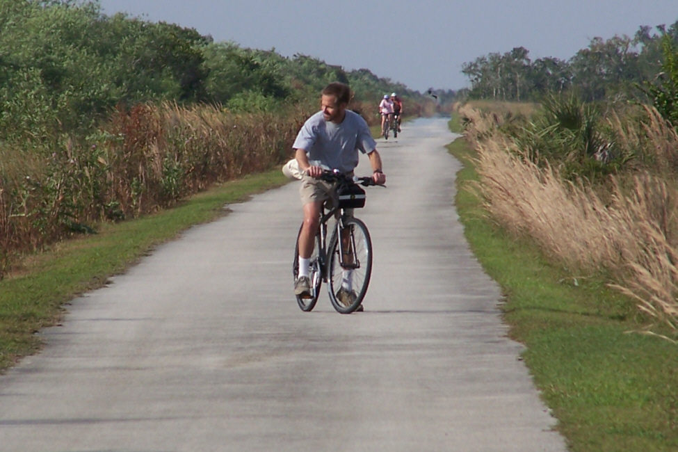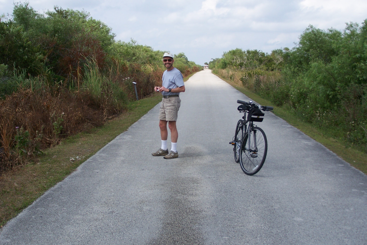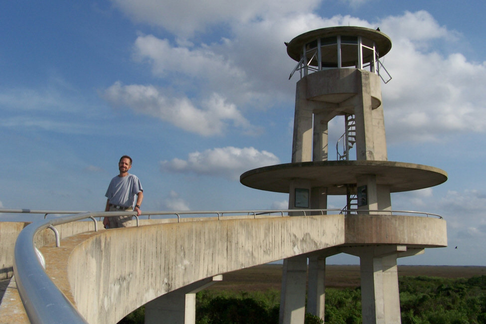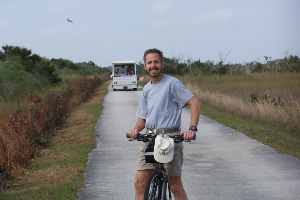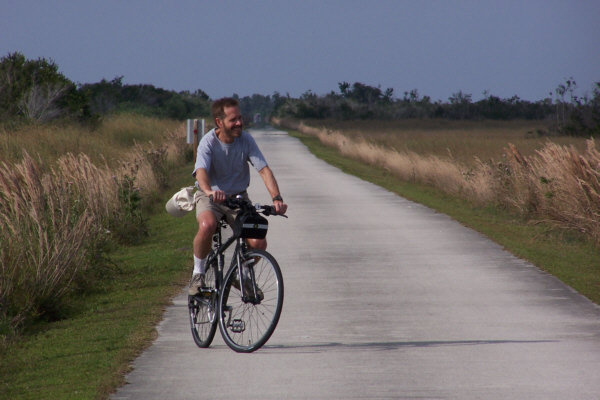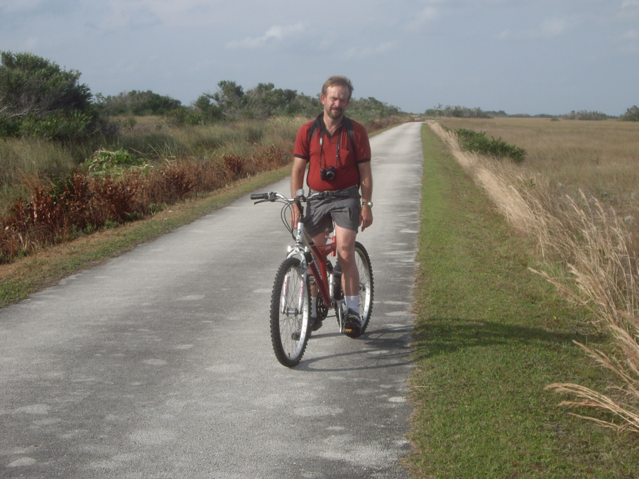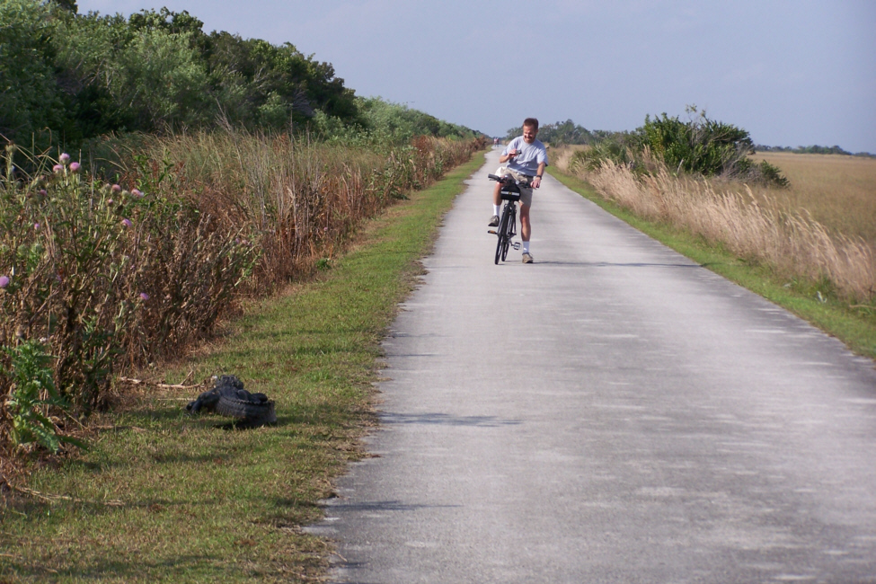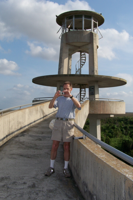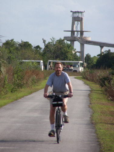 At about the halfway mark in the ride, right at the south end of the Shark Valley road, is the Observation Tower (marked on the map you saw earlier). The picture at left is a bit misleading; Fred wanted me in the picture of the tower at the end of the road, but didn't want me from behind, so I circled back to go towards him- purely for effect.