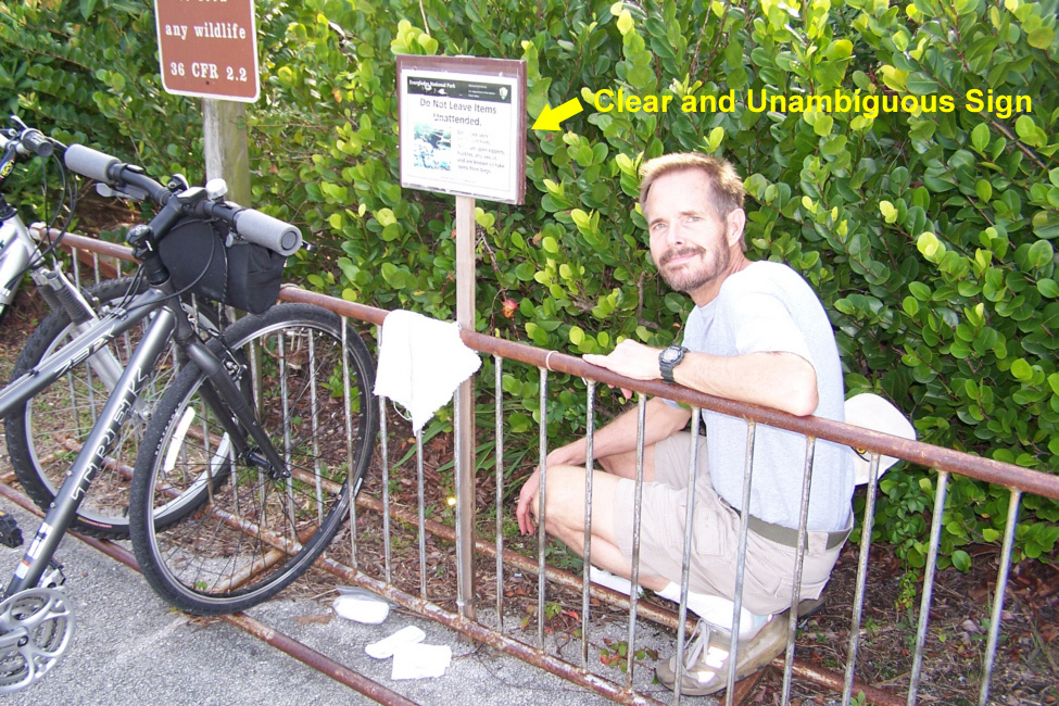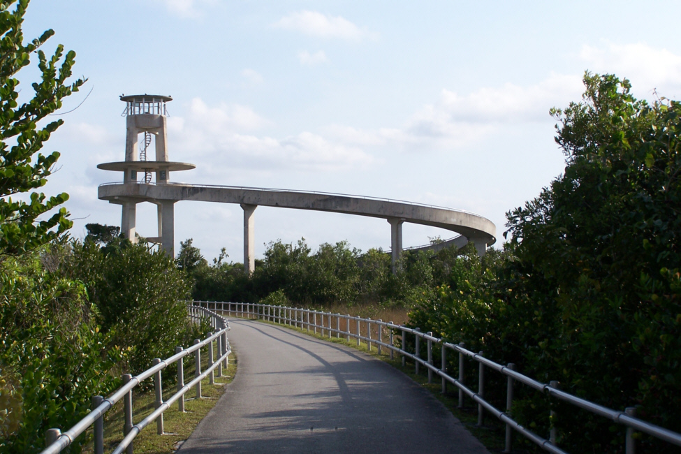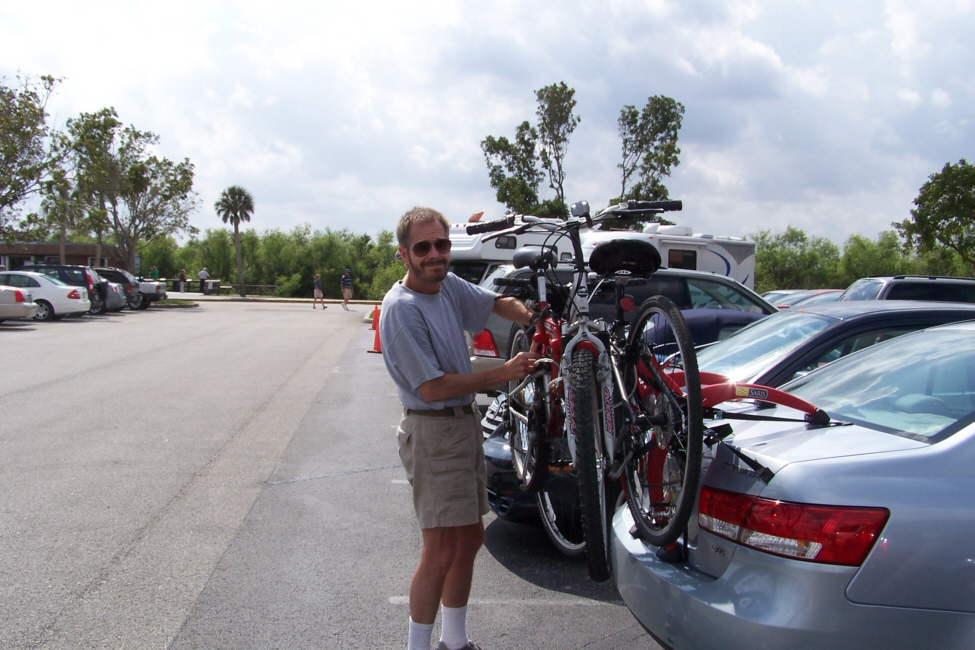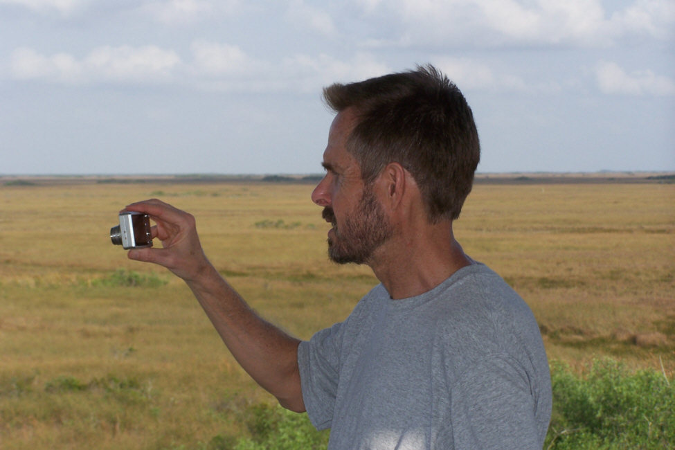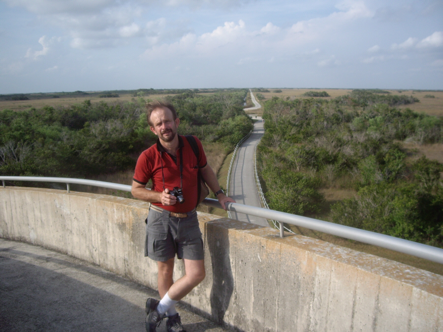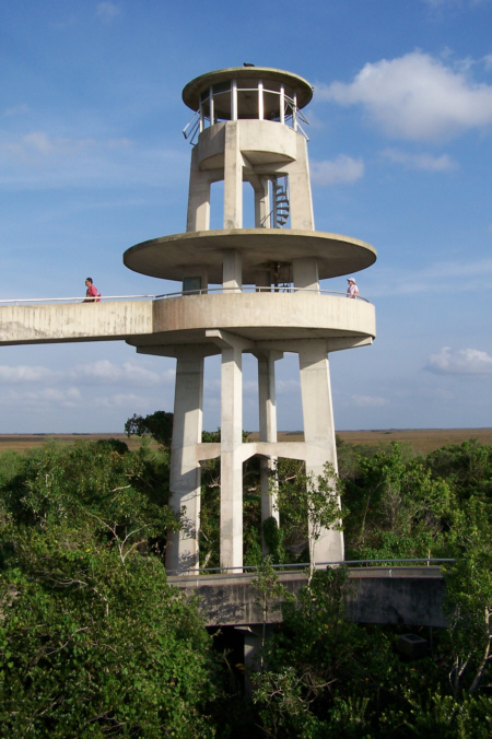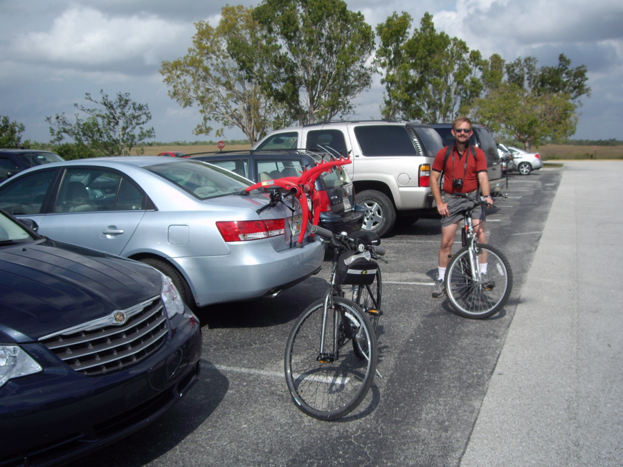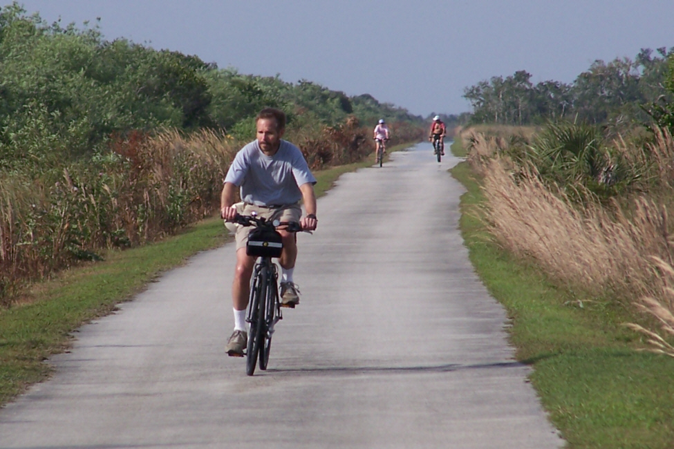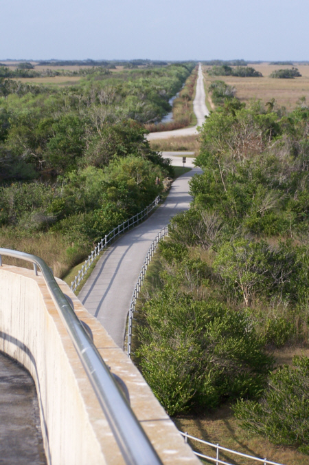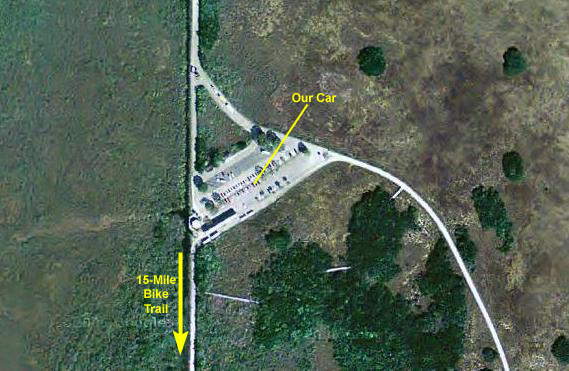 At about the halfway mark in the ride, right at the south end of the Shark Valley road, is the Observation Tower (marked on the map you saw earlier). The picture at left is a bit misleading; Fred wanted me in the picture of the tower at the end of the road, but didn't want me from behind, so I circled back to go towards him- purely for effect.