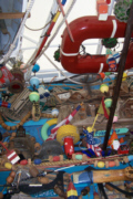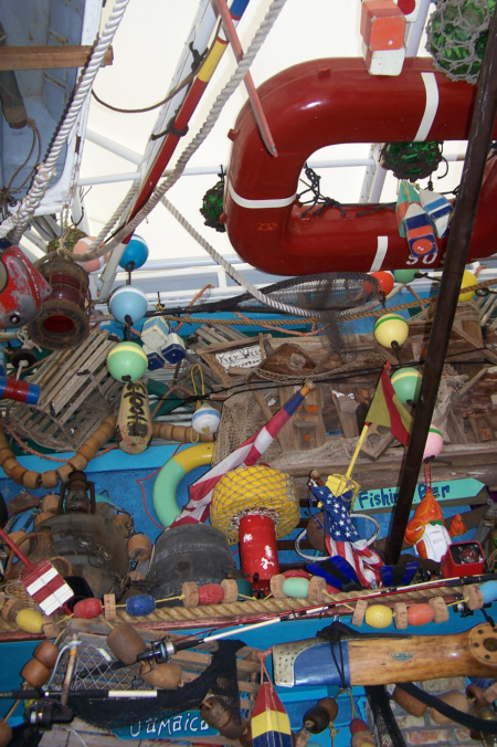 It was fun wandering around the Art Fair; when we got back to the beginning, we made note of the stalls we might like to return to the next day and we went back to the condo. We had been invited by Ron and Jay to have dinner at their house, but we had some time before then, so I did a stint on the exercise bike while Fred surfed the Internet, and then we had our frozen drinks down by the dock. Fred got an amusing pictures of some passengers on one of the passing boats evidently reprising