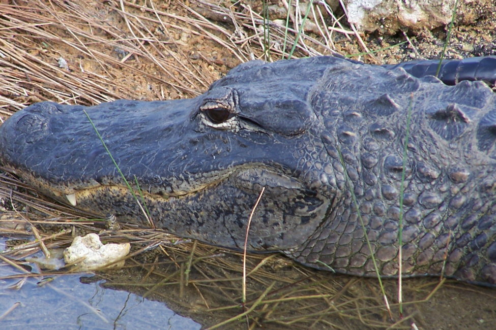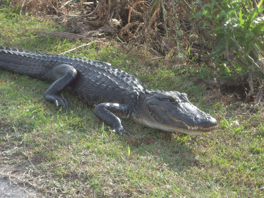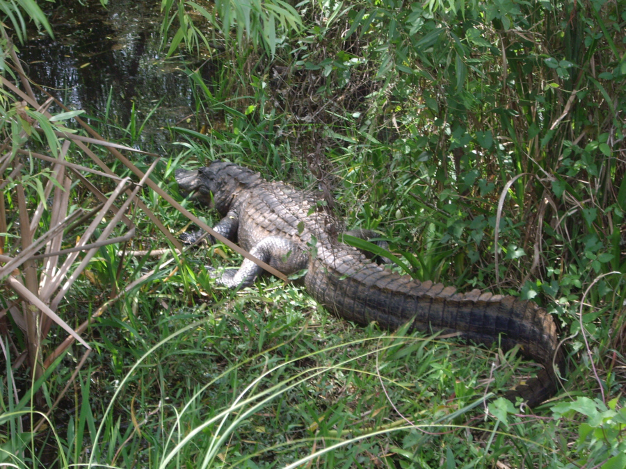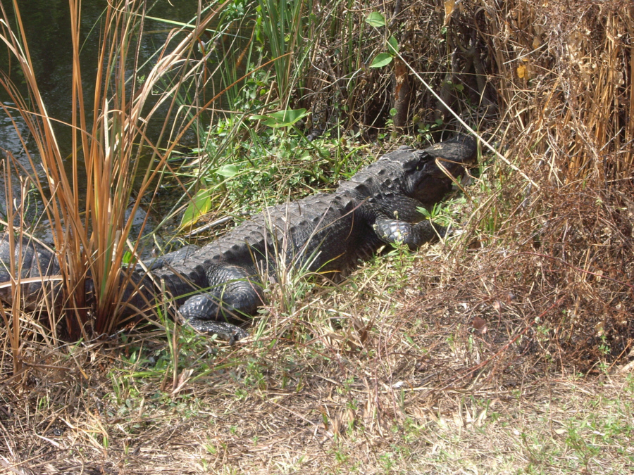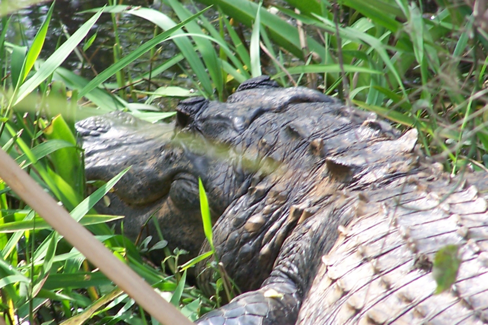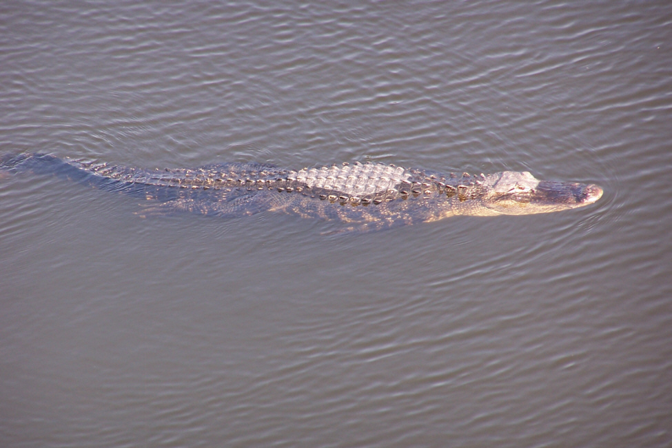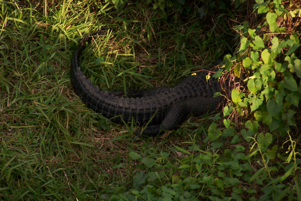 A little further into the ride, we came upon another alligator, but this one was only a foot or so from the edge of the road, so we got a really good view of it. You can take a look at the full-size images we captured of this particular alligator by clicking on the thumbnails below; the first two pictures are Fred's, the second two I took.