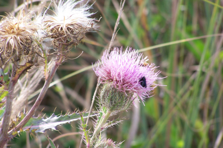 There are also more marine-type habitats, of course, but we are some distance from them, and so won't encounter them today. Today's plants are those of the grassland- grasses and some hardwood stands. One very common plant that we have seen all day is the thistle, shown at right, exactly the same plant that is so prominent in Fred's pasture.