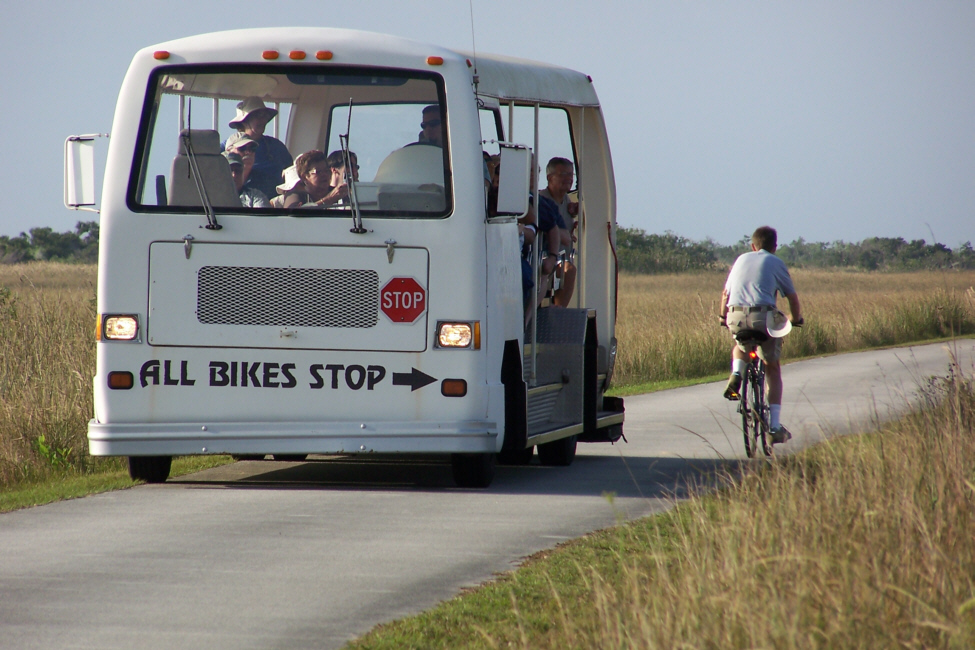 that takes those visitors who either don't want to or can't ride a bike or walk on a circle tour of Shark Valley; bicyclists are supposed to stop when it passes, as it has just done