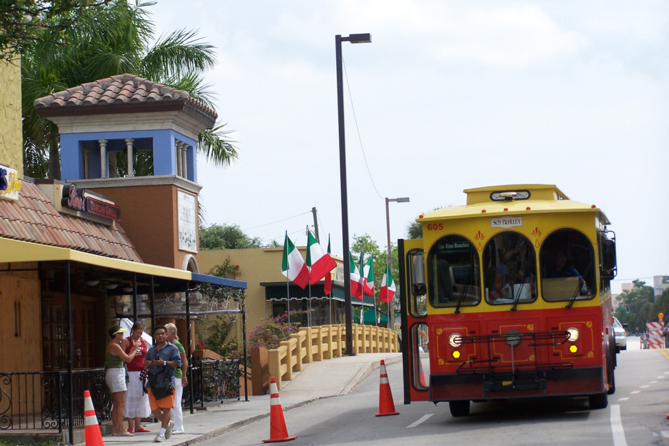 dropping off some people. The trolley is used for various events along Las Olas; for the Art fair, it shuttles people from the parking areas further east to this point where the Art Fair begins.