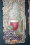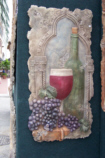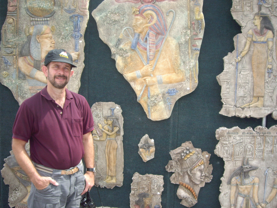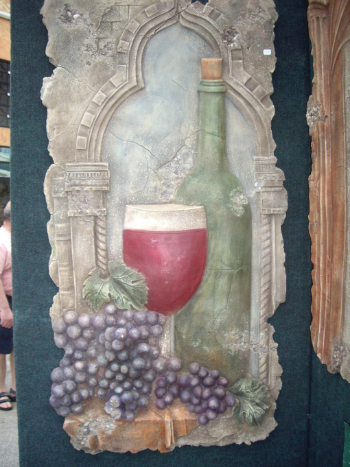 These look like stone slabs that might have been taken from the side of an ancient building- perhaps in Greece, Rome or Egypt. In reality, they are composites. They are shaped and cracked to look very old, but are actually quite light and very sturdy (the cracks being part of the artwork). I could imagine them in gardens or in certain settings within homes or businesses; actually, we thought of Prudence when we saw them. In any event, we took some pictures of them, and they might be of interest to you. Just click on the thumbnails below to view the full-size images, and ignore the fact that Fred seemed only to be able to catch me with my eyes closed: