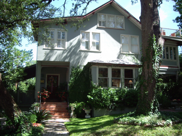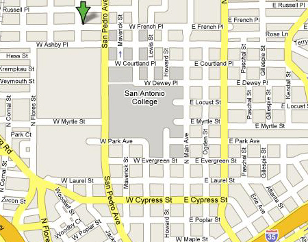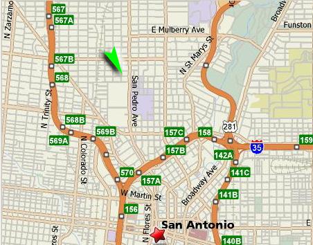 Ron and Prudence asked me to come down and visit at the same time, so I took Tuesday through Thursday to visit with them. When I worked at Pervasive, I would usually drive down from Austin, but now I just hop a Southwest flight. As usual, Ron picked me up at the airport, which is out of the left hand map above to the north. To get to Ruckman Haus, one just takes US 281 south from the airport, getting off at N. St. Marys St. and then zigging and zagging to the west to reach W. French Place. I've pointed out the location of Ron and Prudence's B&B on the more detailed right-hand map. It is located at the northeast corner of W. French and Breeden, just a block north of San Pedro Park, one of the oldest parks in the country.