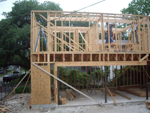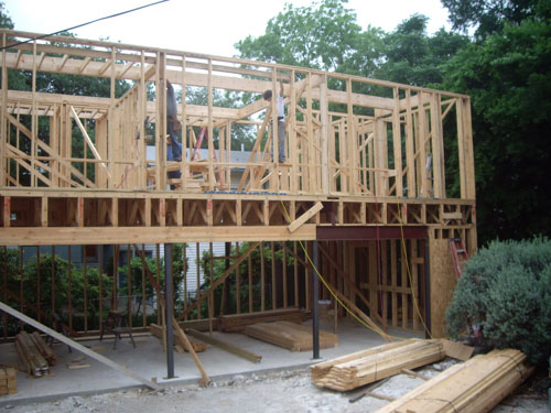 The last time I was here, demolition had begun on the garage, which was, essentially, taken down to the foundation, and is now being completely rebuilt. The two thumbnails below are for pictures of the current progress of the construction, and show the new building as viewed from the back porch of the main house. The left-hand picture is the western end of the building, next to Breeden St., and the right-hand picture is the eastern end.