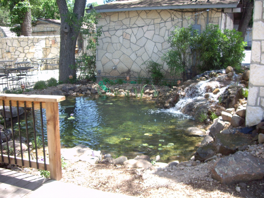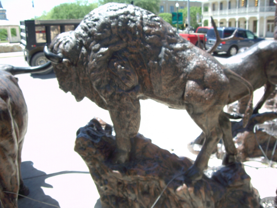About lunchtime, after Ron had cleaned the kitchen, he and I took a ride out to Boerne to see if we could have lunch with his friend Dennis. We got out there and got to the Boerne Vistro, Dennis's restaurant, but he was off somewhere. I did notice that between the restaurant and the small motel that Dennis also owns, he'd put in a water feature that looked really nice. We chatted with Dennis's mom for a while, and then drove on into the center of town so Ron could show me what all had changed since I was last here a couple of years ago. While in town, we drove by what used to be a service station but which was now a shop selling sculptures and other stuff brought up from Mexico. A huge, five-foot-tall bronze buffalo out front caught my attention. We stopped to inquire about it; I thought it would be something really spectacular that Fred could put out in front of his house. I thought the price was reasonable, but I would never buy something like that without checking with Fred first. In any event, Ron thought that he and Dennis had been to the source of these aluminum sculptures on their last trip to Mexico, and he wouldn't let me spend so much money until he'd checked with Dennis; he thought that if I really wanted to get one, I should go with them to Mexico and bring it back on a trailer- saving about $2000 in the process.