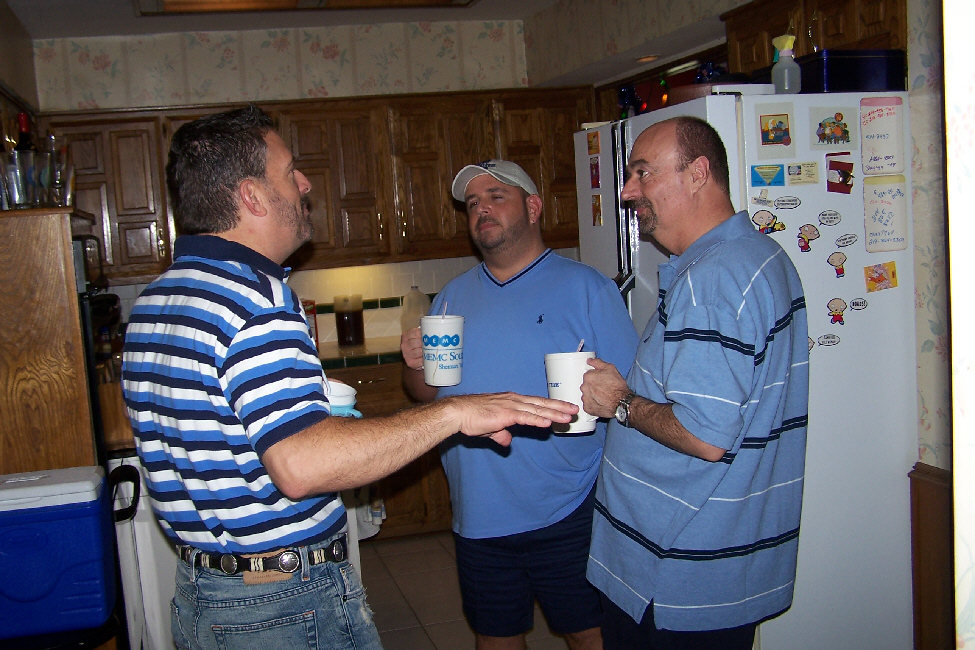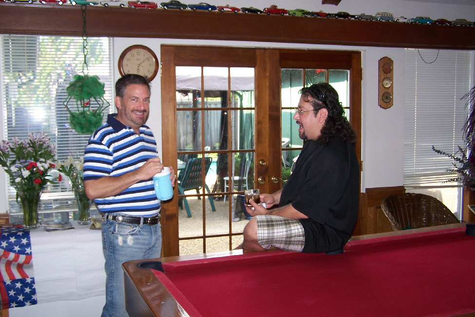 The pictures that Fred and I took during the afternoon and early evening don't form any kind of continuous narrative, or anything like that; they are just casual pictures of the attendees. For example, you can see a picture of Lou Acevedo, Jay Silbert and Ron Drew conversing in the kitchen if you click here. Or, you can see a picture of Ron Mathis, Chris and myself chatting in the gameroom if you click here.