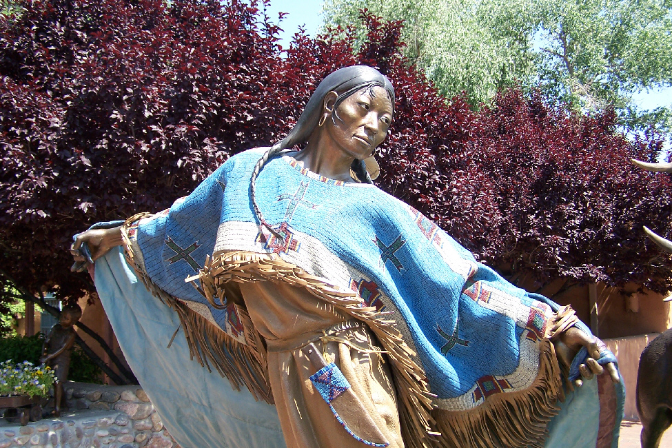 Then we went across the street to a rather odd store for Canyon Road- a bookshop. While it was a specialty bookstore, it was the sculpture outside that was the real attraction. Right outside the main entrance was a bronze boy with books. Around the corner of the building was a unique archway sculpted into bronze books. Through the archway was a really beautiful sculpture garden, full of sculpted children all with a "learning" theme. Finally, just outside this garden we found an incredible sculpture of an Indian maiden. The interesting thing about this sculpture was that it wasn't "bare," but there was sculpted clothing as well, and the entire sculpture was realistically painted. Both the pictures that Fred took of this particular sculpture were really great, and you can see those pictures by clicking here and here.