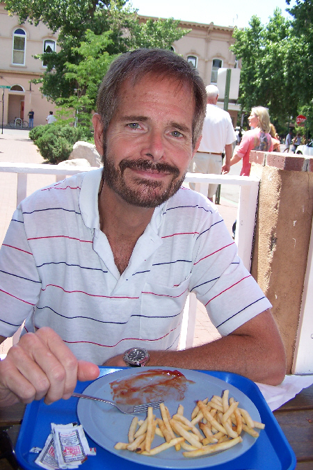In the town square, there were lots of people sitting in the sunshine around the central monument dedicated to the founding of Santa Fe, many of them eating lunch purchased from one of the many vendors lining the square. We walked up the side of the square, though, to a small restaurant off on a side street- one that we'd eaten at before when we were here last with Ron and Prudence. They served lots of different stuff, but I had my usual lunch. After lunch, we stopped at the corner where there was a sculpture that was particularly photogenic. We'd seen this sculpture before, and I recall that there is a picture of Fred standing with it earlier in this photo album; this time, Fred captured the sculpture and I.