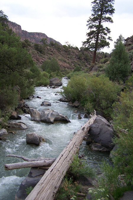 From the top of the cliff, a trail leads down to the river. The hike is about a mile and a half, and very steep for the first two-thirds of it. From the top of the cliff, the Rio Grande looks really small (even though it IS pretty narrow this far north). We started off on the hike, with Fred leading the way down the trail. We both took some pictures on the way down the trail, but most of them were too dark to include here. But when we got down toward the bottom of the trail and the Rio Grande River itself, the skies brightened up quite a bit, and we got some pretty good pictures.