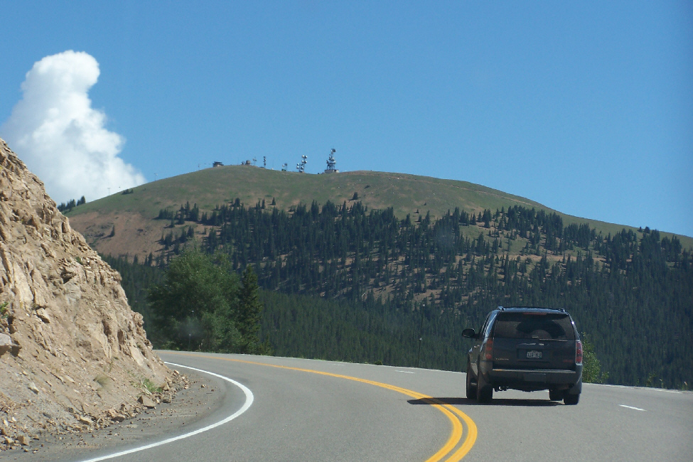 When we reached Highway 50, we turned east again and after about forty miles began to climb steadily into the Rocky Mountains. After a long, long period of ascending steadily, we rounded the last curve and could see ahead the transmission towers just above Monarch Pass.