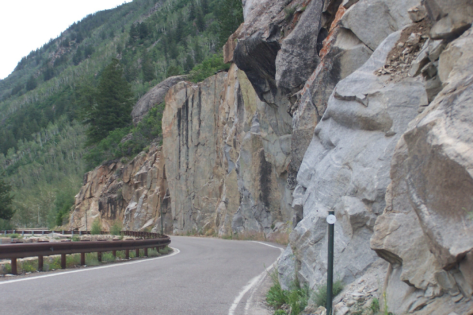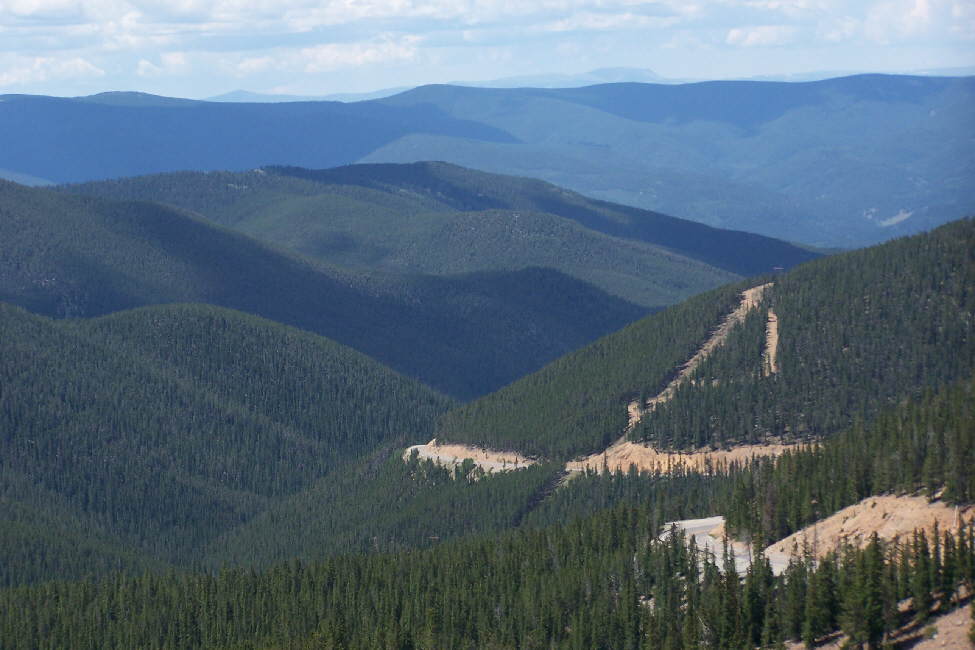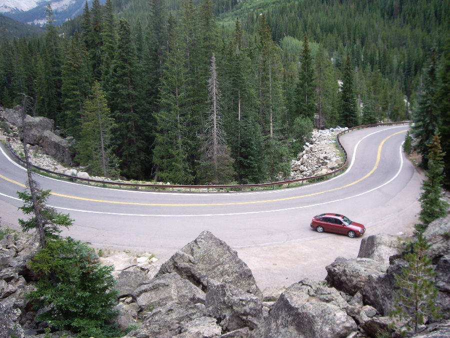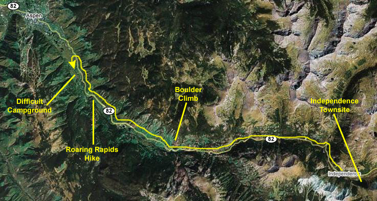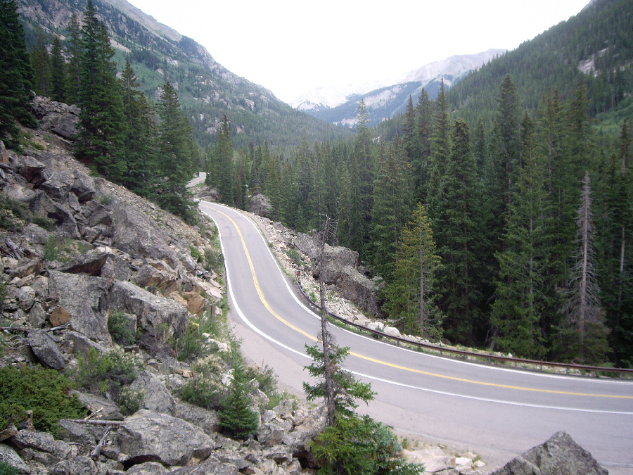 Leaving Independence Pass, we continued west on Colorado 82, this time steadily descending. After just a few miles of driving, we stopped and, through a break in the drizzle, got an excellent view of the highway behind us. Ahead was Aspen and the campground we wanted to use.