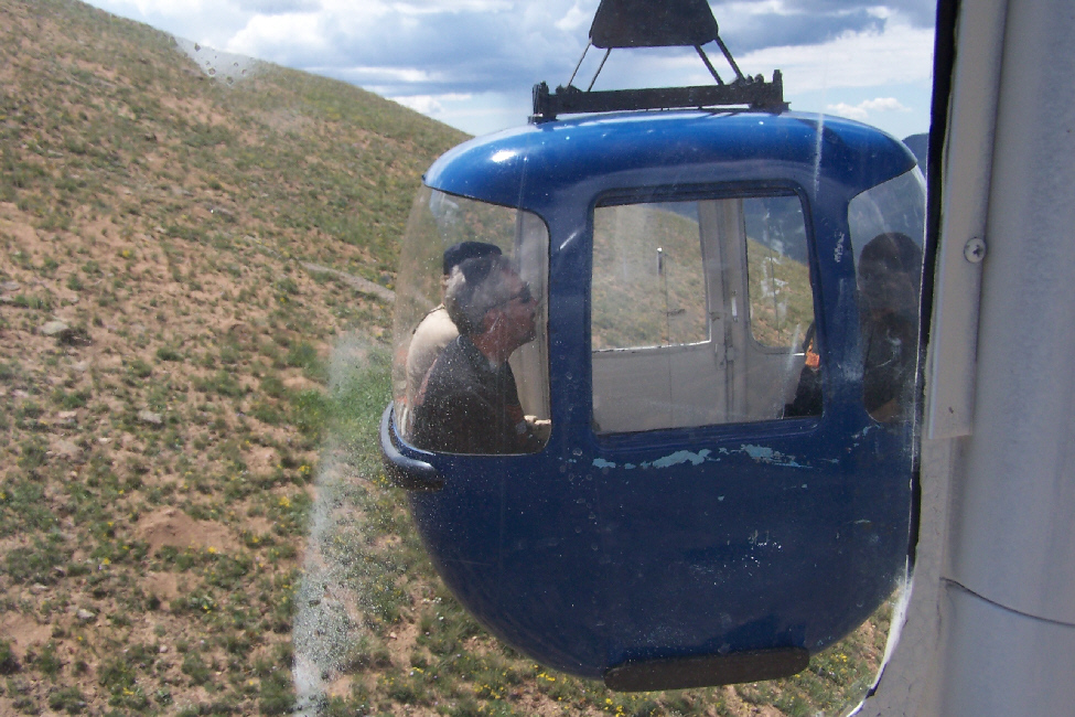 From inside the tramway cars, we got some great views. Of course, we each had to take a picture of the other riding in the car, so here's me and here's Fred. As we ascended, other gondolas passed us going in the other direction, of course, but mainly we just admired the views, as in this case looking north across the Rocky Mountains and some mountain thunderstorms.