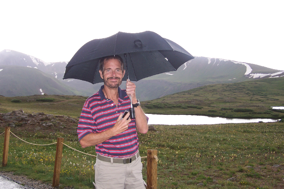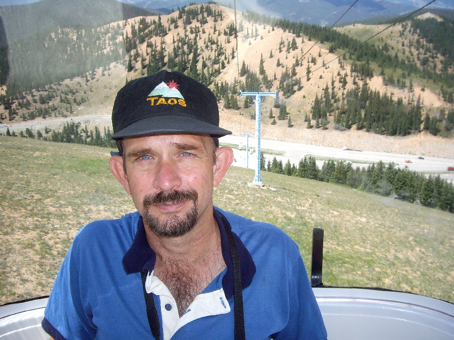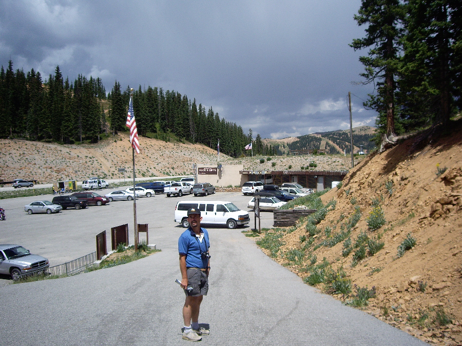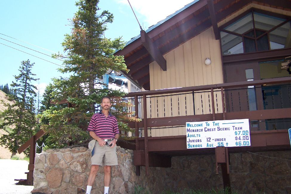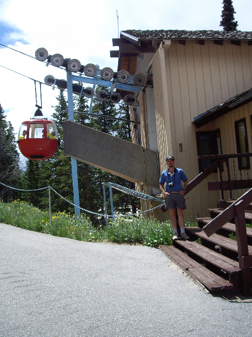 After spending quite a bit of time at the top of the mountain, we caught another gondola and headed back down to the tram station, and took another couple of pictures of it, one with Fred and one with me. We headed down the walkway to the main parking area and headed out to the middle of it where the marker denoting the continental divide was placed. This was our third crossing of the divide on this trip, and as usual we wanted to record the event, so here is Fred at the continental divide, and here is a picture of me at the divide.